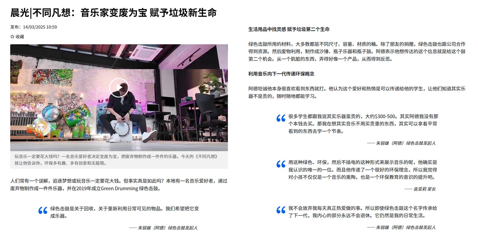 Zhu Ruixiong, who promoted the concept of "green drumming", said in an interview: "The process of turning useless garbage into fun musical instruments fully demonstrates the essence of sustainable development, allowing young people to experience the meaning of turning waste into treasure while playing."